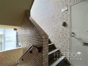 敷地入り口には重厚な門戸があり、プライベート感のあるつくりです。エレベーターはありませんが、最上階でも4階のため、無理なく生活できそう。階段手前には郵便ポストと宅配ボックスも設置されています。