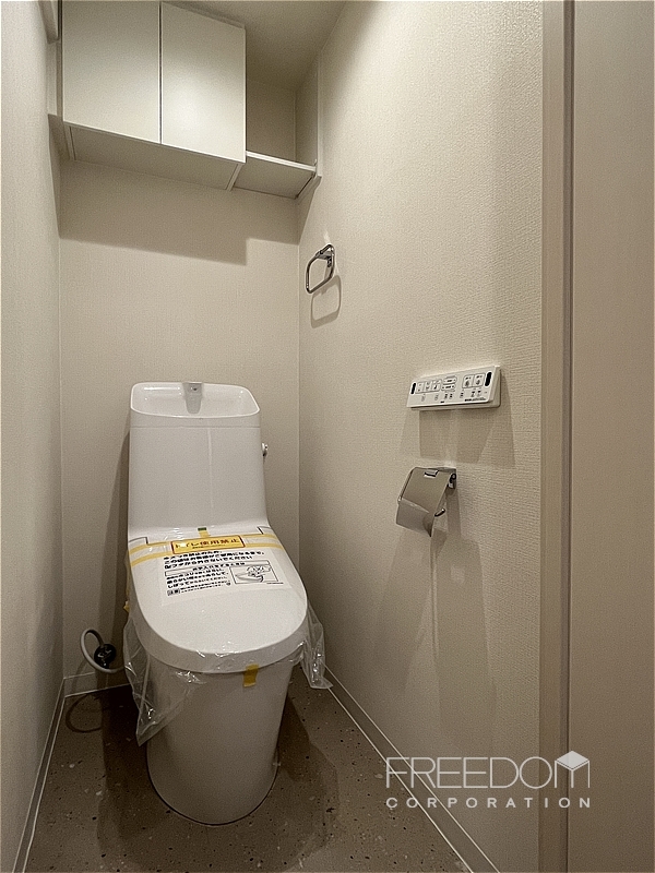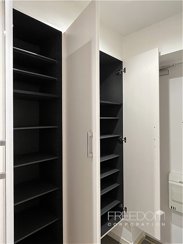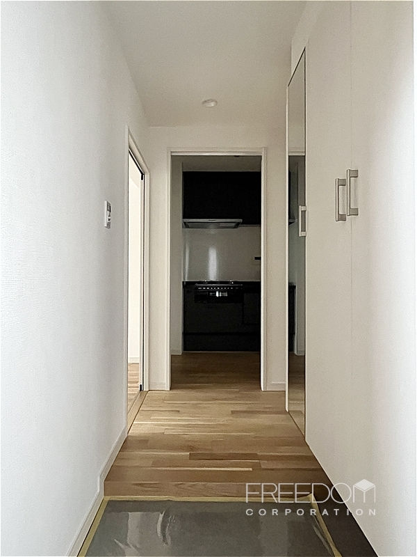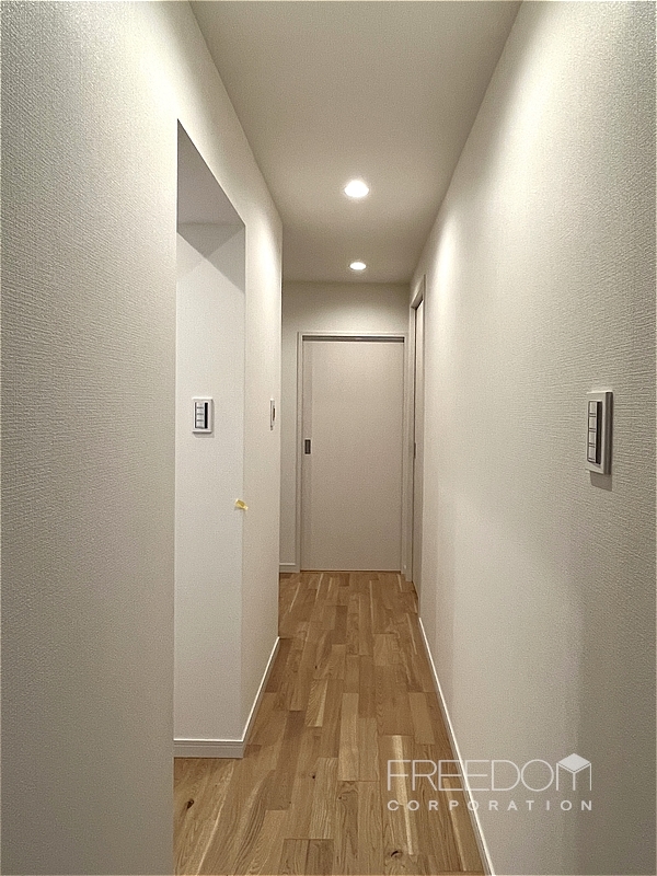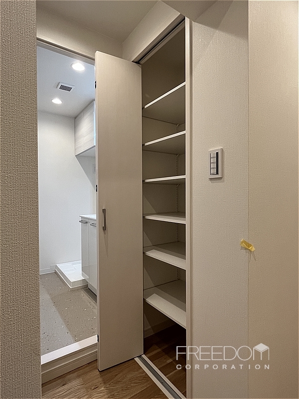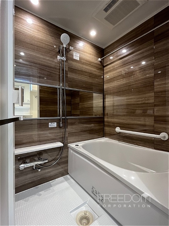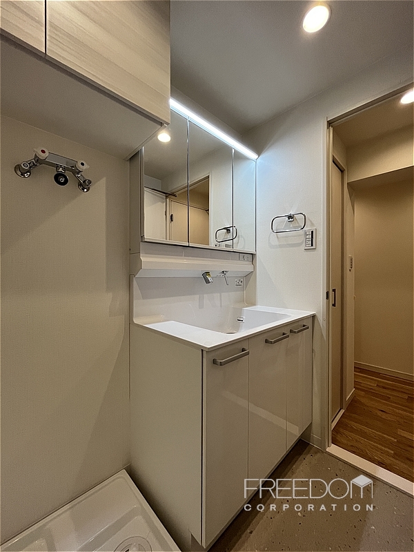 水まわりも全面リニューアル済みです。洗面室やトイレ、浴室が近くにまとまった配置で、毎日の家事や身支度もスムーズに行えそうです。手前には扉付きの収納棚があり、リネン類や洗濯用品の整理に便利です。浴室には追い焚き機能や浴室換気乾燥暖房機も備わっており、快適にお使いいただけます。