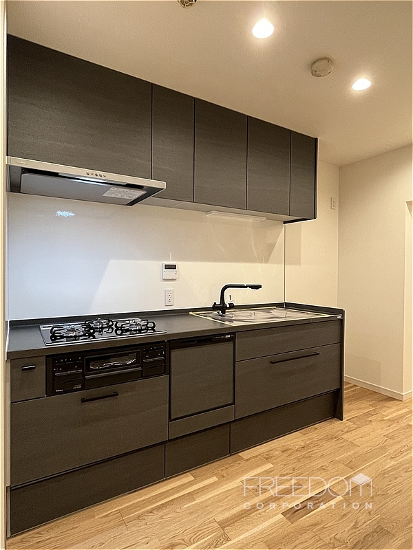 LDから適度な距離を保ったセミセパレートのキッチン。十分な広さがあり、玄関側とLD側の2方向から出入りできるのも便利です。