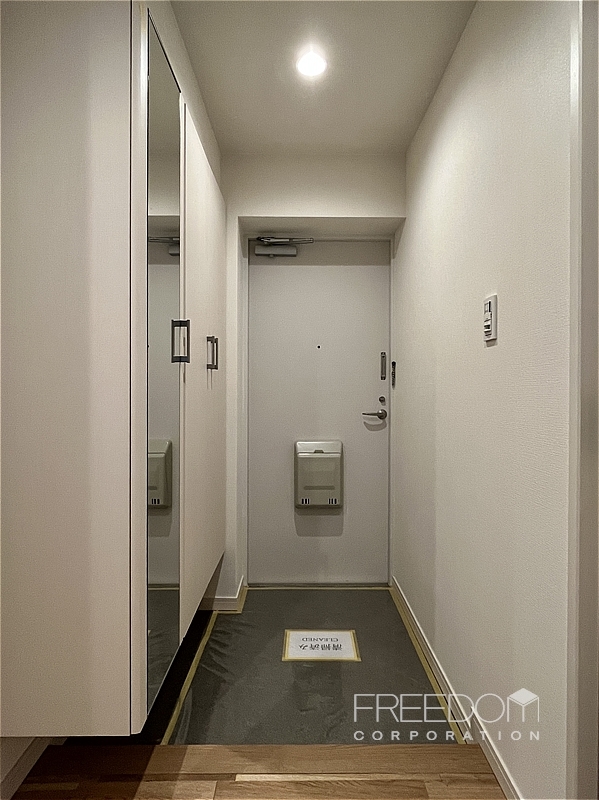 玄関にはシューズクローゼットがすっきり収まっており、姿見も付いています。リビングなどの居室が直接見えないセンターイン型のつくりで、自然とプライバシーが守られ、落ち着いて過ごせそうです。