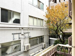 北西向きの腰窓からの光は控えめですが、窓を開けても静かで落ち着いて過ごせそうです。視線を向けると、植栽の紅葉がちらりと目に入り、さりげなく季節の移ろいも感じられます。