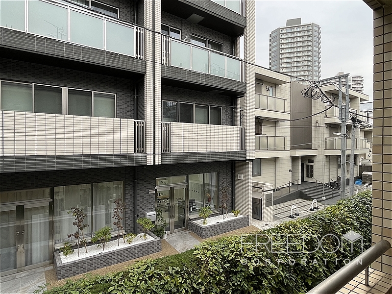 リビングと洋室にまたがるワイドスパンのバルコニー。正面にマンションが建っているので、視線はやや気になる印象でしたが、道幅分の距離は保たれています。車や人の通行も少なく、和やかな雰囲気です。
