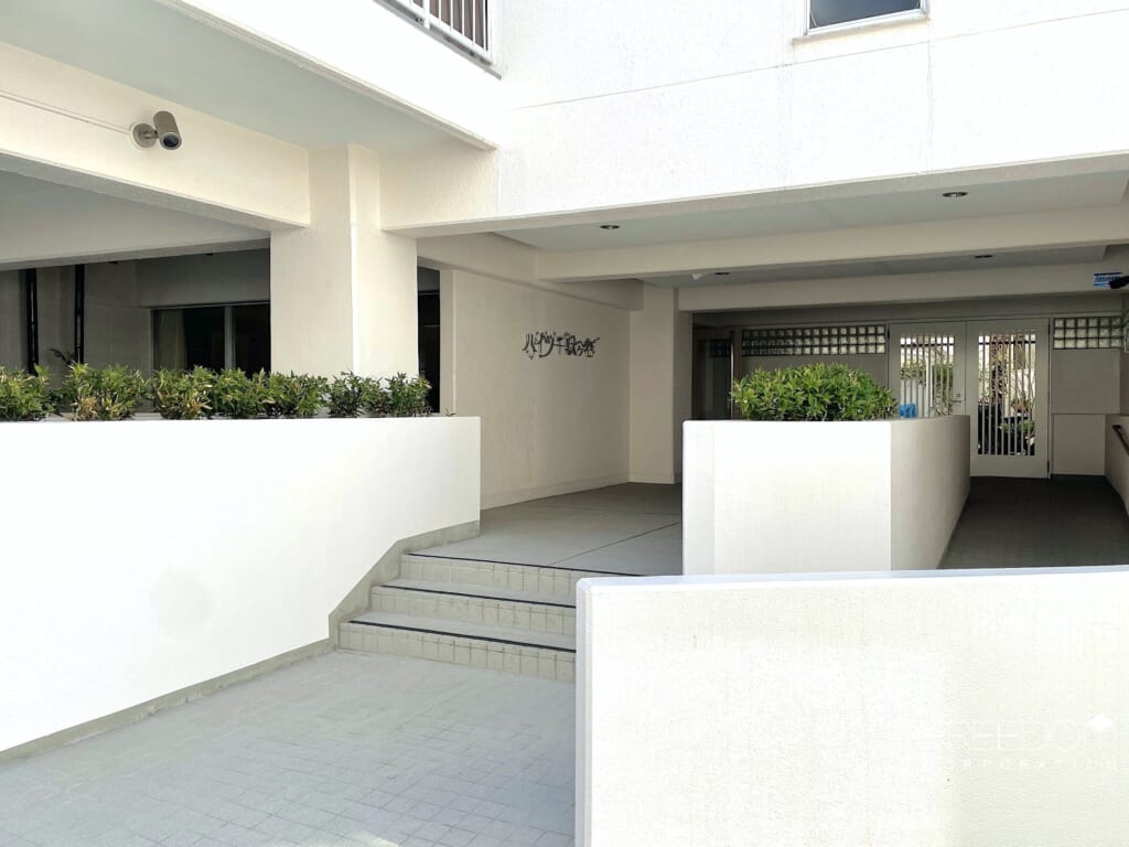 エントランスは通りからやや奥まった位置にあり、プライバシーに配慮されています。エントランス奥のゲートを抜けると駐輪場、そのさらに奥にゴミ捨て場があります。エントランスは夜間オートロックでセキュリティー面も安心です。共用部には植物や絵画がさり気なく飾られ、愛着をもって管理されている様子が伺えます。