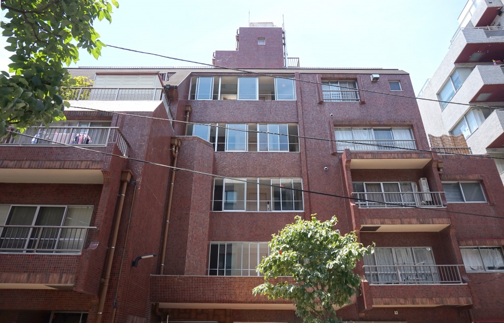 1976年築の5階建て、総戸数20戸の落ち着いた規模感のコミュニティです。外観はレンガタイル貼りで、アールの意匠や場所によって異なるタイルの貼り分けなど、この年代らしいこだわりが随所に感じられるレトロな佇まいです。