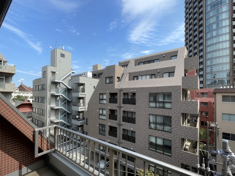 バルコニーは東向き。都心の駅近という便利な場所にありながら、午前中から爽やかな日差しが期待できます。前方にタワーマンションが聳えていますが、一定の距離があるため日照が遮られることはなく、圧迫感の少ないのどかな眺めです。