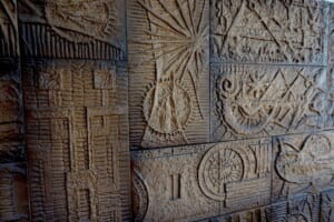 マンション名の縦長のフォントもヴィンテージ感があり、濁点も渋カワイイ。壁面のレリーフやエントランス扉の取っ手の風合いも素敵…