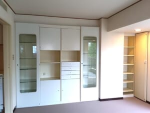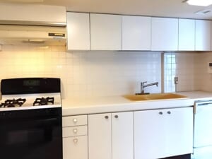 LDKは約28帖もの贅沢な広さ。掃き出し窓やコーナーサッシが開放的で、窓辺には街路樹の緑が映る、くつろぎのリビング空間です。壁面収納やキッチンなどの設備は経年を感じるものの、懐かしさを感じるレトロな趣きです。