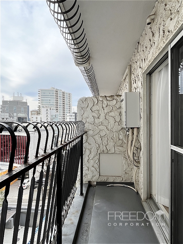 洋室とリビングにまたがるワイドスパンのバルコニー。正面にマンションが建ってしまいますが、一定の距離があるため閉塞感は和らぎそうです。はす向かいには駐日ブラジル大使館がちらりと見えます。日系ブラジル人の建築家ルイ・オオタケが設計したモダンな建築で、このエリアらしい洗練された空気が漂います。秀和ならではのレトロな鉄柵もかわいい。