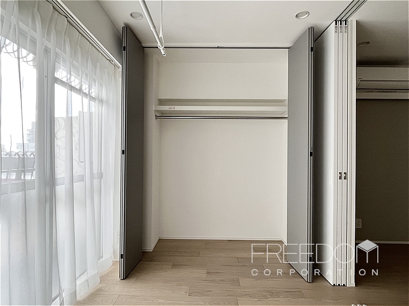 もう一部屋の洋室は約3.6帖です。共用廊下に面した腰窓がありますが、北向きのため日中も照明が必要です。日照は淋しいものの、奥行きのあるクローゼットと収納棚、エアコンも備わり、柔軟に使えそうなお部屋です。