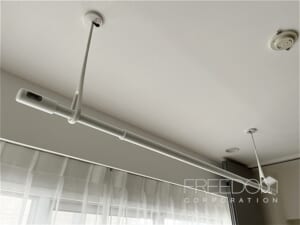 リビングとの仕切りには、床にレールのない引き戸を採用しています。白の建具は閉め切っても圧迫感がなく、開け放てばリビングと一体感のある広々とした空間に。大きなクローゼットに加え、必要な時だけ取り付けて使える室内物干しも備わっており、日々の暮らしに寄り添った工夫が感じられます。