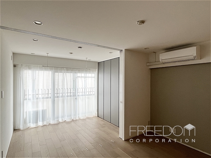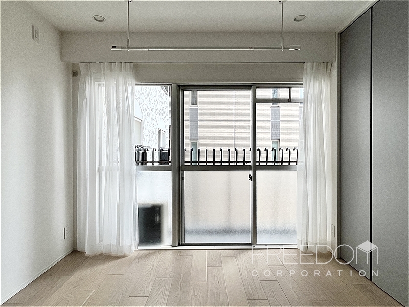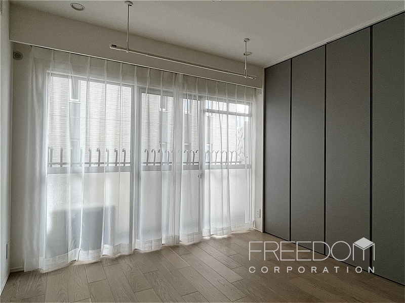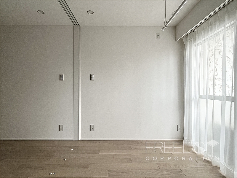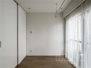 約7.8帖としっかりとした広さのあるベッドルーム。北側の窓はお隣マンションの壁向きですが、こちらも2面採光で明るい空間です。ベッドを置いてもまだ広さがあるので、テレビなどを置いてリビングのように使うこともできそうです。