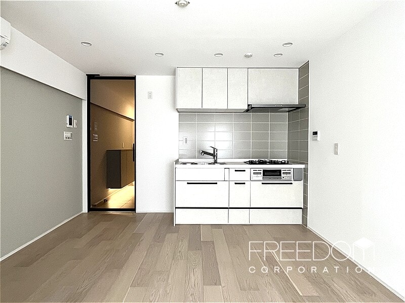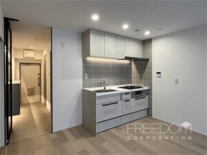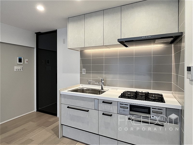 キッチンは、空間を広く使えるすっきりとした壁付けタイプ。壁のクロスと色味を合わせたグレーのタイルも端正な印象です。3口コンロや浄水機能付き水栓など、使い勝手のよい設備も備わっています。