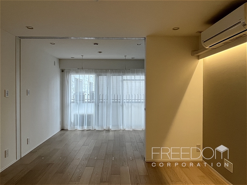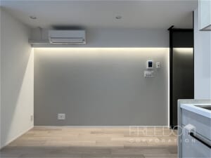 LDKは約7.5帖。バルコニーからは少し奥まった位置にありますが、洋室越しにやわらかな光が届きます。壁面のアクセントクロスや間接照明の陰影もさり気ないアクセントに。エアコン1基が設置済みで、入居後すぐの生活を始められます。