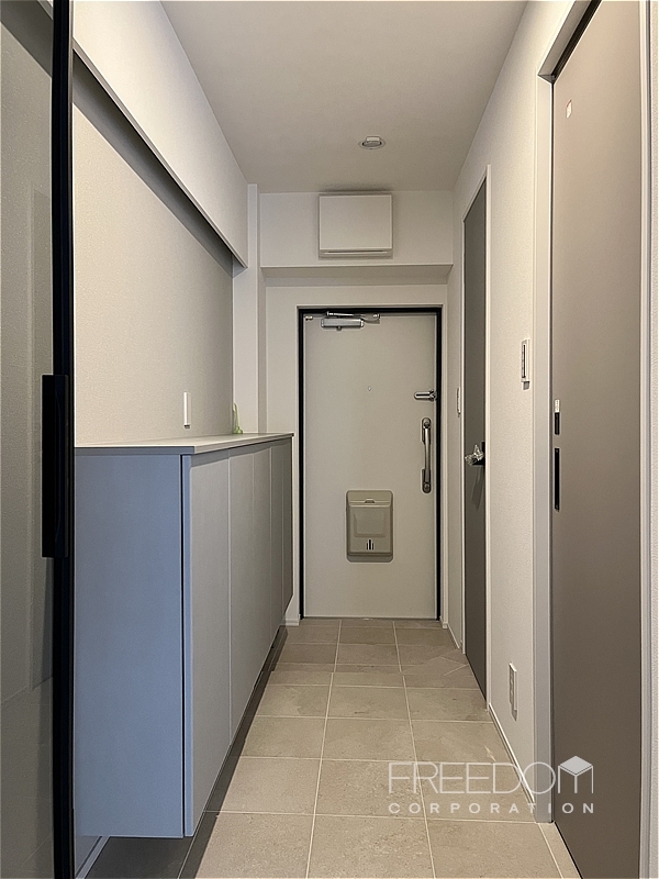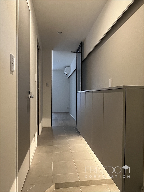玄関床から廊下にかけては、硬質感のあるタイルがあしらわれ、カウンタータイプのシューズボックスが並ぶ豊富な収納量も魅力です。建具はマットなグレージュで統一されており、ミニマルな内装の美しさが映えます。