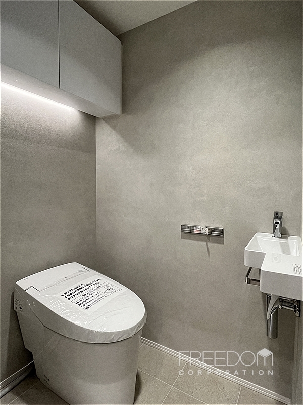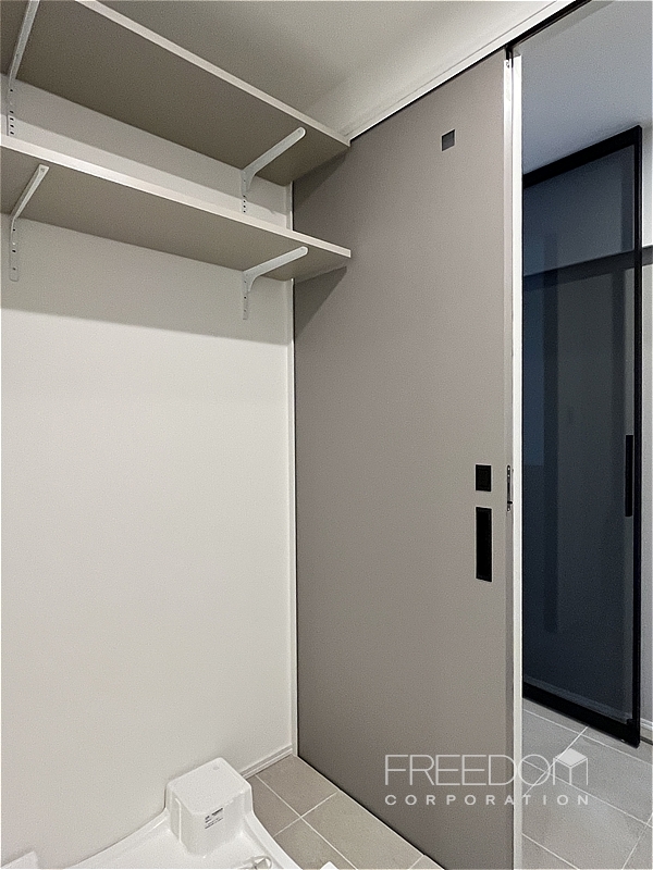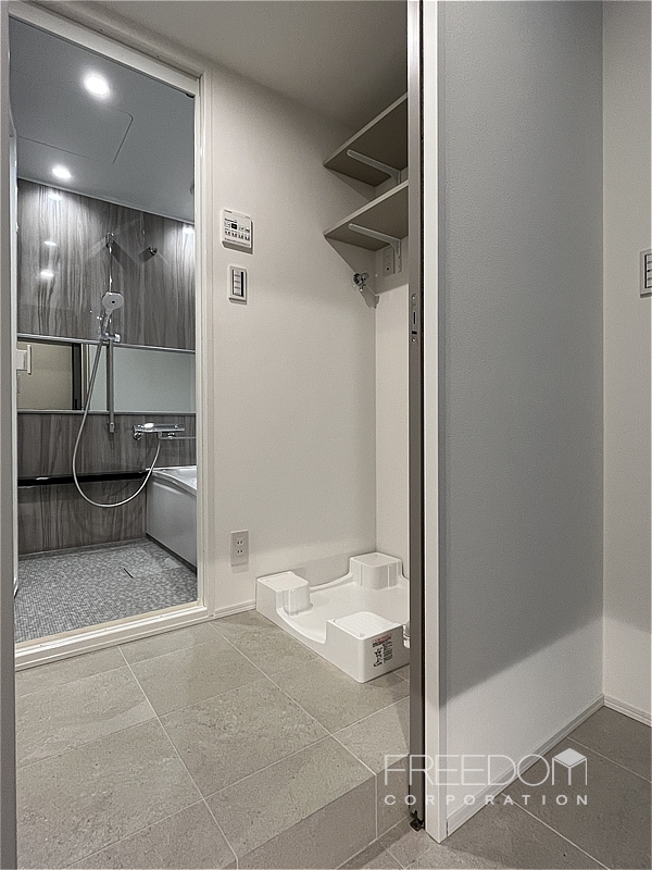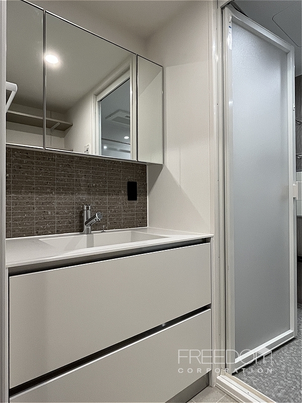 真新しく気持ちの良い水回り。シャワールーム仕様ですが洗面室やキッチンとも同じ色味で統一感のあるデザインです。