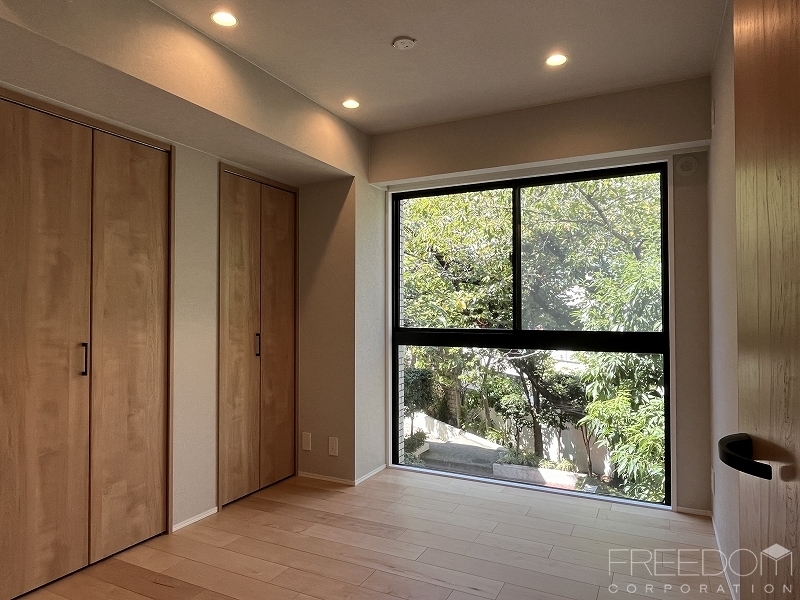玄関そばの5.6帖の主寝室は窓から見える敷地内の大きな桜の木がとても爽やかで、個人的にとても心惹かれた空間です。