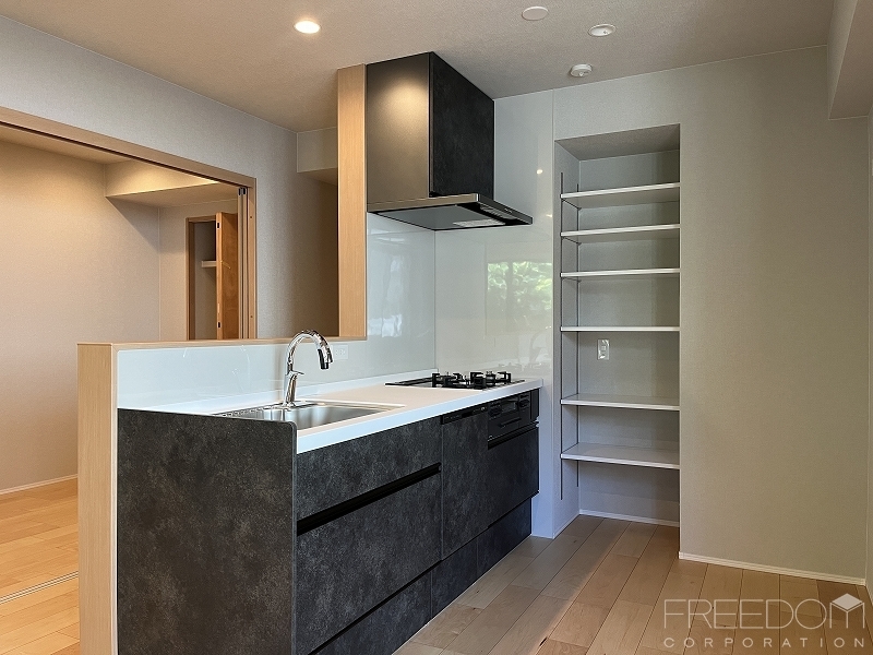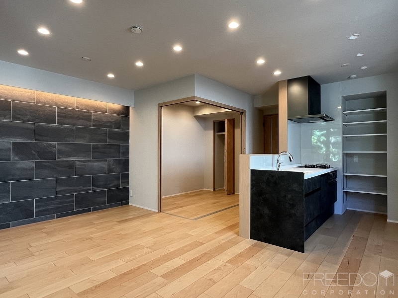 リビングダウンライトは全て調光可能。キッチンはシンプルですが背面のスペースにゆとりがあるので収納棚なども追加で置けそうです。