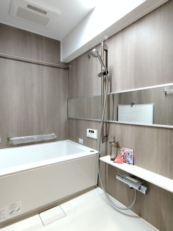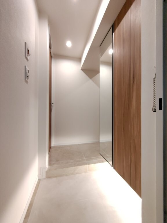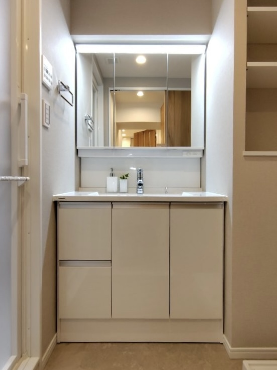 洗面室、浴室、トイレなどの水まわりもリニューアル済み。浴室には追い焚きや浴室換気乾燥暖房機を備え、快適にお使いいただけます。玄関はコンパクトながらシューズボックスがすっきり収まり、姿見も設置されているため、出かける前の身支度に便利です。玄関から室内が直接見えず、廊下も短めで居住空間を効率的に使った点も好印象です。