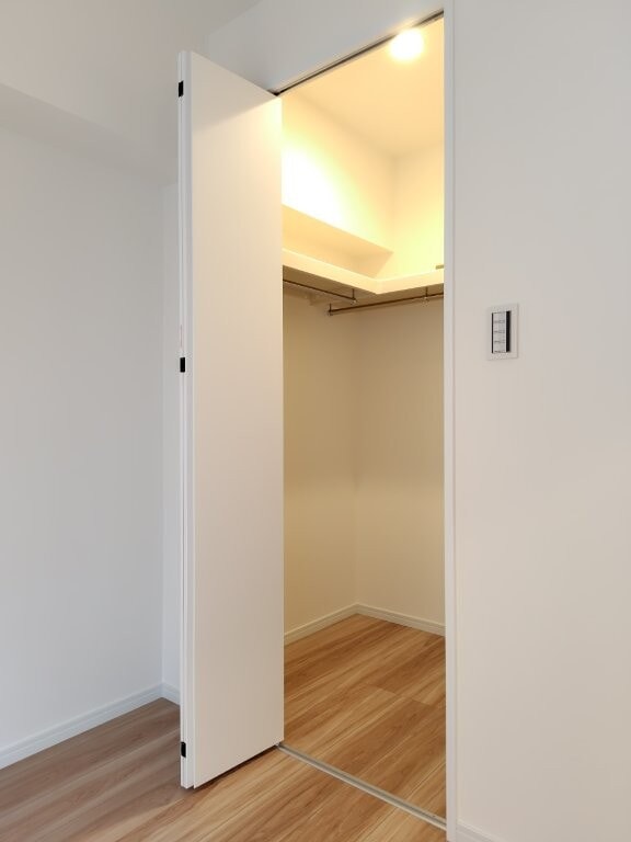 洋室は約5.0帖で、南東向きの大きめの腰窓があります。リビングに比べてバルコニーがない分、窓からの光がより入りやすく、明るさを感じられます。大型のウォークスルークローゼットも備え、収納も充実しています。
