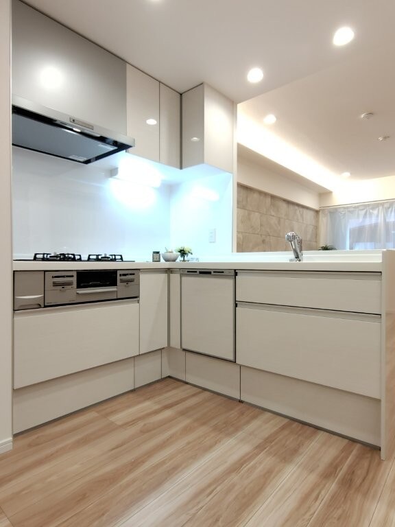 キッチンスペースはゆとりをもって確保され、L字型で使いやすいシステムキッチンには食洗器も備わっています。