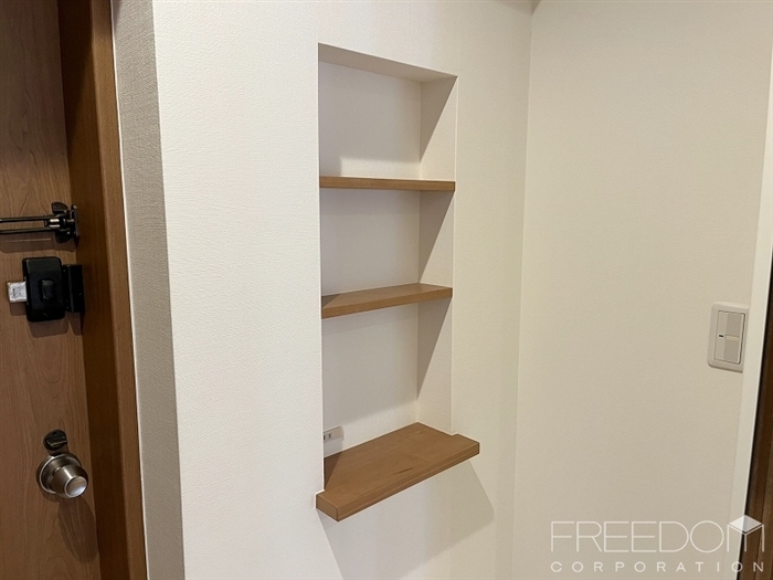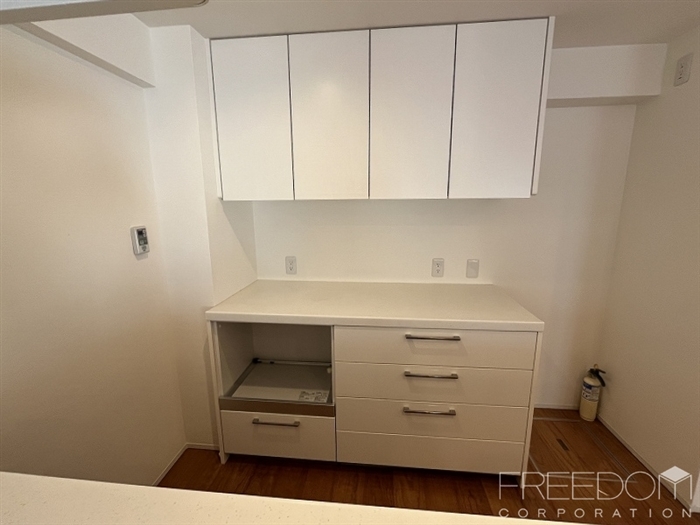 ダイニングスペースに設置されたカウンターテーブルと壁付け収納は、お部屋に合わせて売主さまがオリジナルで造作されたもの。床やキッチンの色味と調和しており、デザイン性にも配慮しながら機能性を高める、行き届いた配慮とセンスを感じます。