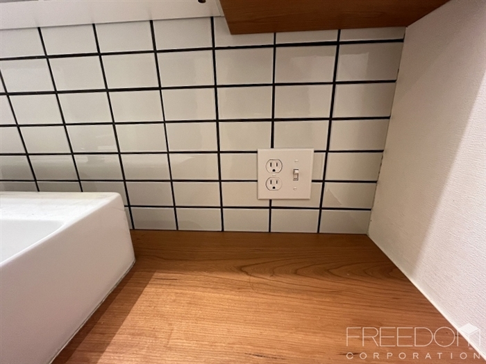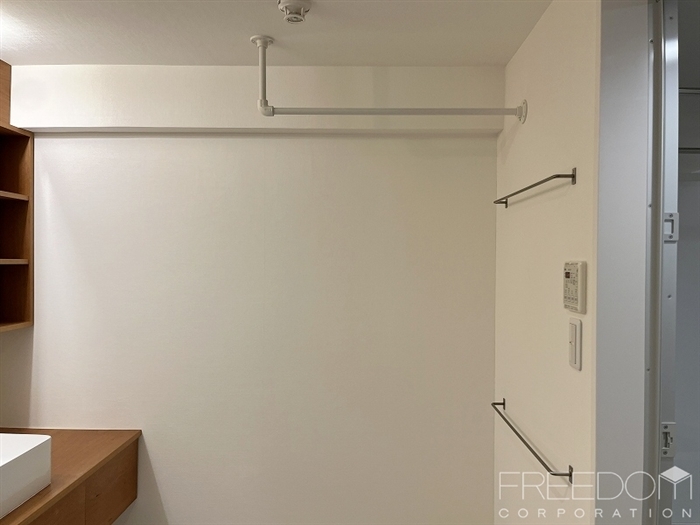 明るい色を基調とした清潔感のある水回りスペース。洗面室には大容量の収納と天井付けのパイプハンガーが備えられており、家事動線を考慮した使い勝手の良いつくりです。造作の木製洗面台が空間を引き締めるアクセントになっていますね。コンセント部分に採用されたアメリカンスイッチなど、細やかなディティールの遊び心も素敵です。