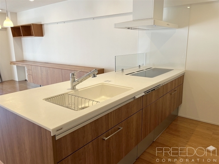 キッチンは家族やゲストとの会話が弾むオープンな対面式。横並びの3口IHコンロは手前のスペースも広く使えるため、下ごしらえや盛り付けの際もストレスを感じさせません。背面にはカップボード収納と冷蔵庫スペースもしっかり確保されており、明るく使い勝手のよいキッチンです。