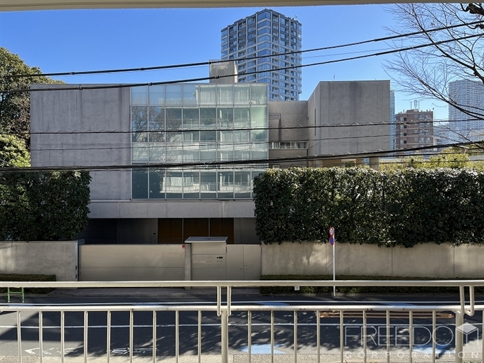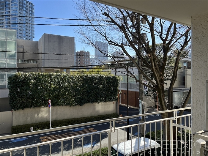 バルコニーから外に目を向ければ、敷地内の大きな樹や近隣の歴史的邸宅の深い緑が視界に入り、都心にいることを忘れさせる穏やかな眺望が広がります。また、住戸間を跨ぐように設置された繊細で美しい手摺が、このマンションの上品な佇まいを作り出していますね。
