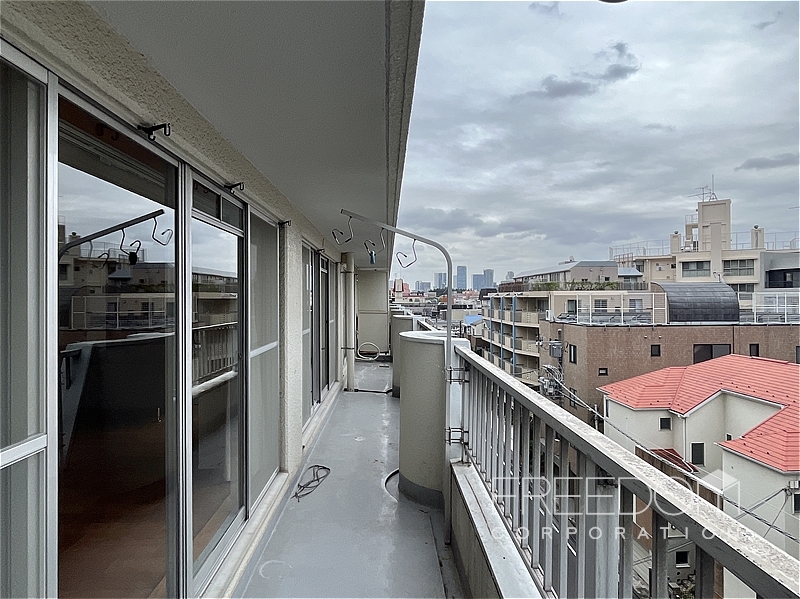 居室をぐるりと囲むL字型のバルコニー。南西側は戸建てや低層の建物が並び、開放的な雰囲気。空も広く仰げるため、晴れた日にはより一層爽やかさを感じられそうです。
