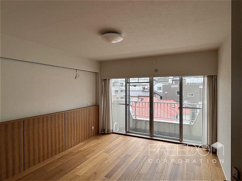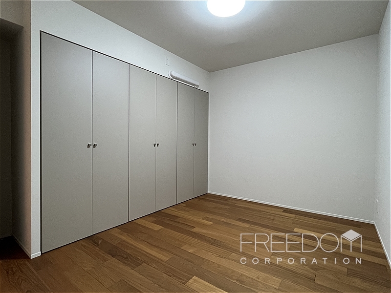 ガラスパネルでゆるやかに仕切られた洋室2。約8.5帖の広さがあり、南西向きの掃き出し窓が並ぶ開放的な空間です。両開きの収納が3か所に設けられており、収納力も十分。