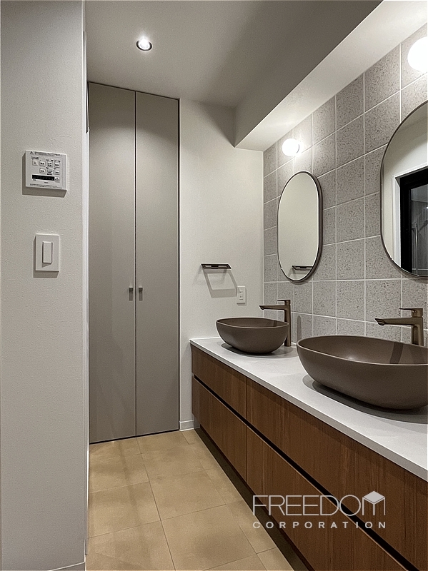 洗面台は使い勝手の良いダブルボウル仕様で、下部には引き出し収納、さらに大容量の両開き収納を備えています。収納力が高く、生活感をしっかり隠して、いつでもすっきりとした印象を保てます。テラゾータイルの壁やラウンド型ミラー、手洗いボウル、ヴィンテージ感のある水栓金具など、細部にまでミッドセンチュリーの世界観が息づく空間です。