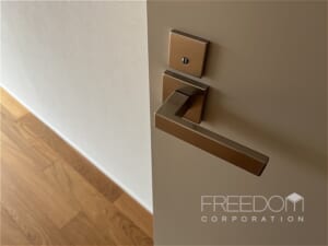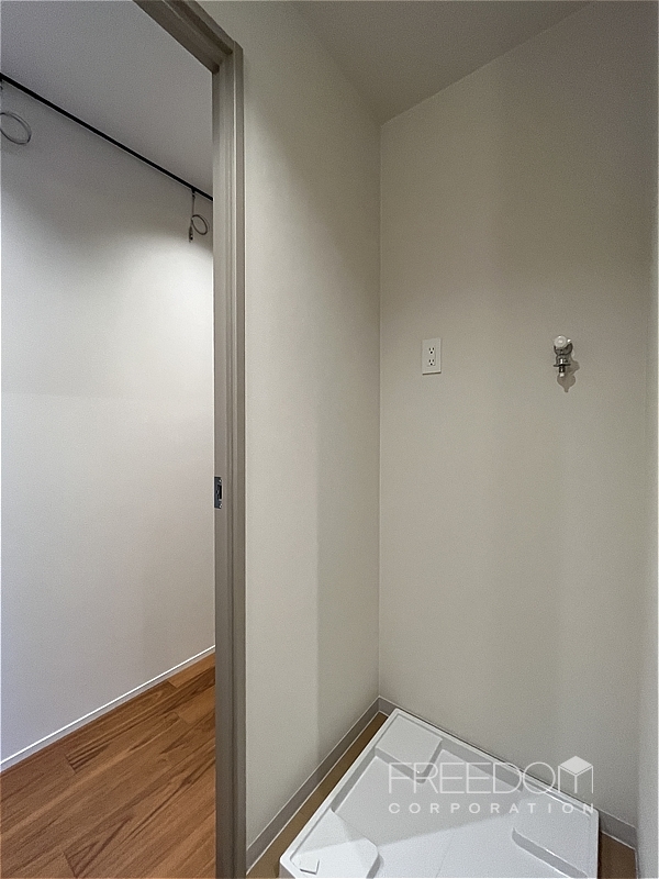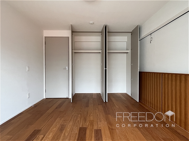 約8.7帖の洋室1もバルコニーに面しており、陽当り・通風ともに良好。クローゼットもしっかり備わっています。アクセントにあしらわれたチーク材の袖壁は15cmほどの厚みがあるので、飾り棚やヘッドボードのようにも使えそうです。