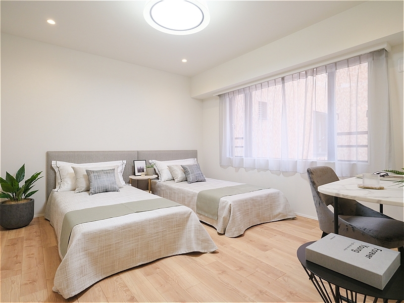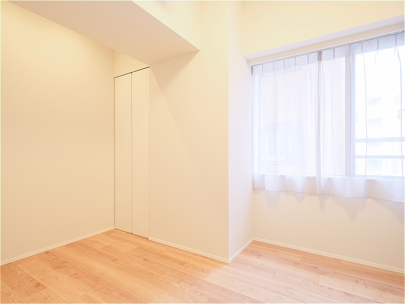 凹凸の少ない整形の空間で、ベッドを並べて配置してもゆとりがあります。システム収納を備えたウォークインクローゼットもあり、寝室として快適にお使いいただけます。