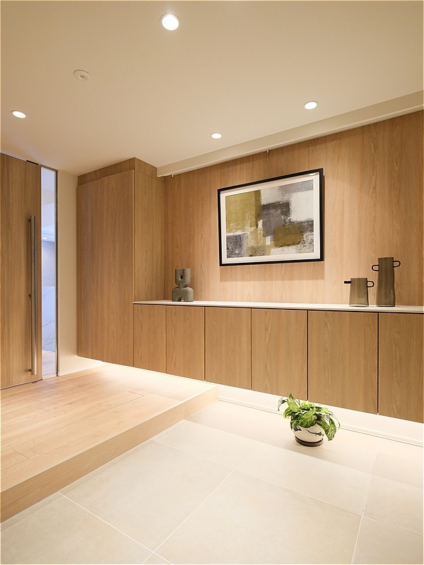 廊下ホールは短く、玄関はゆったりとした広さ。明るく品のある空間に、カウンタータイプのシューズボックスと収納が並び、収納力も十分です。