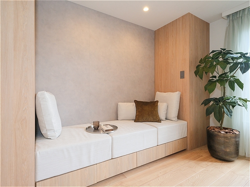 リビングとダイニングのゾーニングもしやすく、大型家具も余裕をもって置けます。一角には造作ソファがすっきりと収まり、下部は引き出し収納になっている点も便利です。