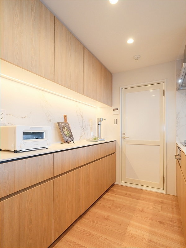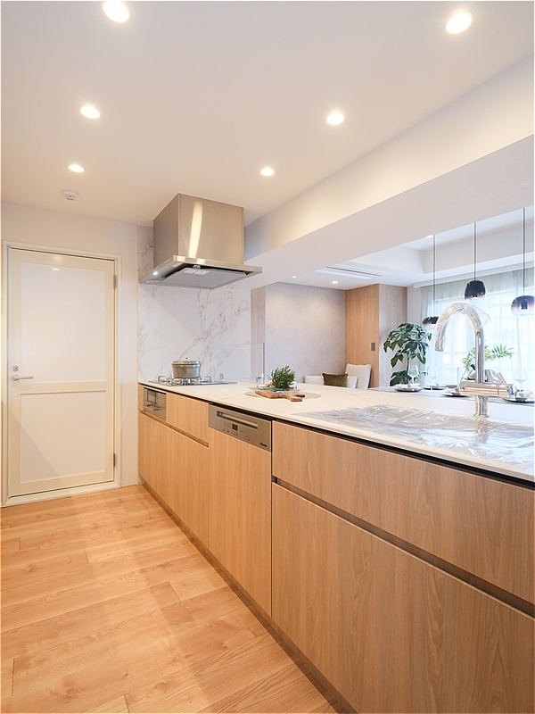 開放感のあるペニンシュラキッチンは、田中工藝社製のシステムキッチン。家具のように空間になじむデザインで、背面にはお揃いのカップボードも備わっています。色合いや素材感が整っているのはもちろん、使い勝手にも配慮された、行き届いたキッチンです。