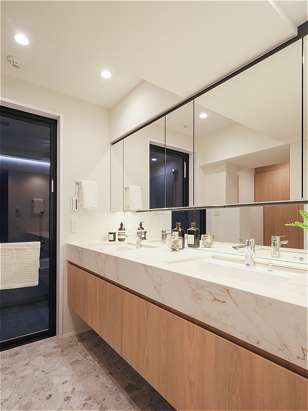 洗面室はホテルのように上品な雰囲気。ダブルボウルの洗面化粧台は、キッチンと同じく田中工藝製です。Mieleの洗濯機・乾燥機も備わっています。