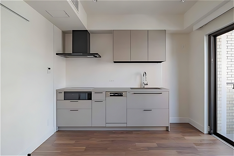 空間に美しく調和するグレージュの壁付けキッチン。すっきりとした見た目ながら、スリムで開口部の大きな食洗機を装備しており、デザインと実用性を兼ね備えています。