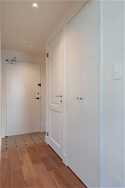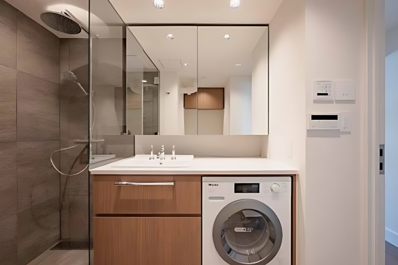 廊下を短く設計した効率的な間取り。白い框扉を開けると、洗面台・トイレ・シャワーブースを一室に集約したサニタリー空間が広がります。バスタブのない合理的な仕様ですが、オーバーヘッドシャワーやMiele製洗濯機など上質な設備が整っています。