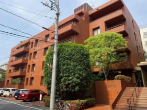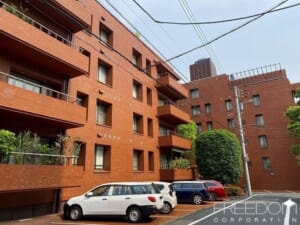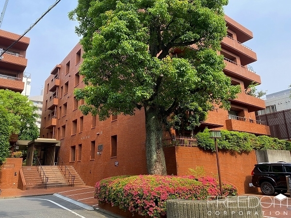 1976年10月築で地上5階建、総戸数は47戸。赤茶の煉瓦タイル張りの重厚感溢れる外観に豊かな植栽が映えて、ヴィンテージマンションらしい風格のある佇まいです。