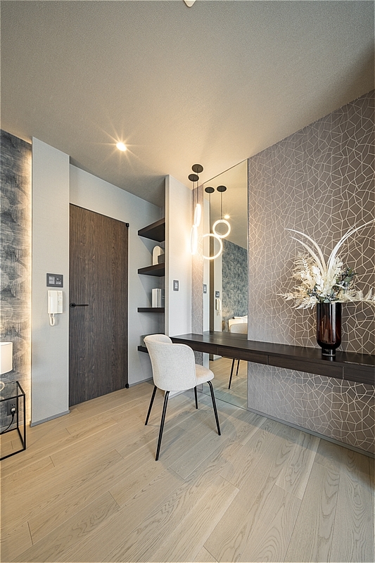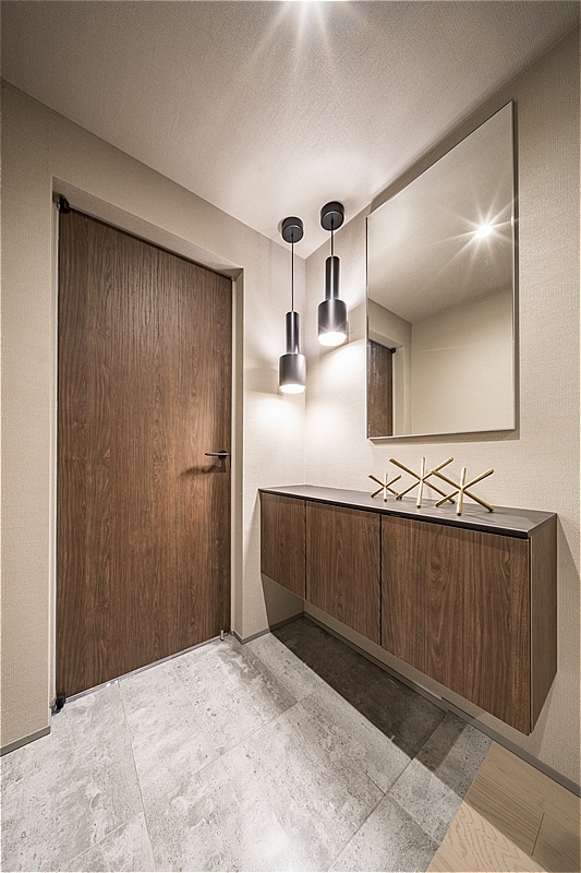 玄関ホールも、邸宅のゆとりを感じさせる贅沢な広さ。大きな鏡やペンダントライトも映える優雅な空間です。