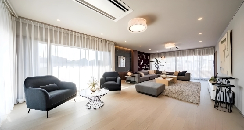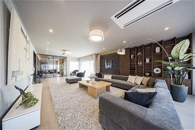 柱や梁の出っ張りが少ない整った整形空間である点も魅力。大型の家具をはじめ、お気に入りのアートや観葉植物も存分に配置できる大らかなリビングです。床暖房や天井カセットエアコンなどの設備も整い、年間を通して快適に過ごせそうです。