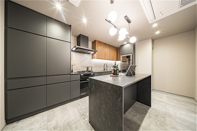 また、廊下側へも抜けられる2way動線により、水回りへの移動もスムーズ。アイランドカウンターを中心に、浄水器や食洗機、さらにはコンベックやワインセラーまで完備するなど、ハイスペックな仕様が整った上質なキッチンです。