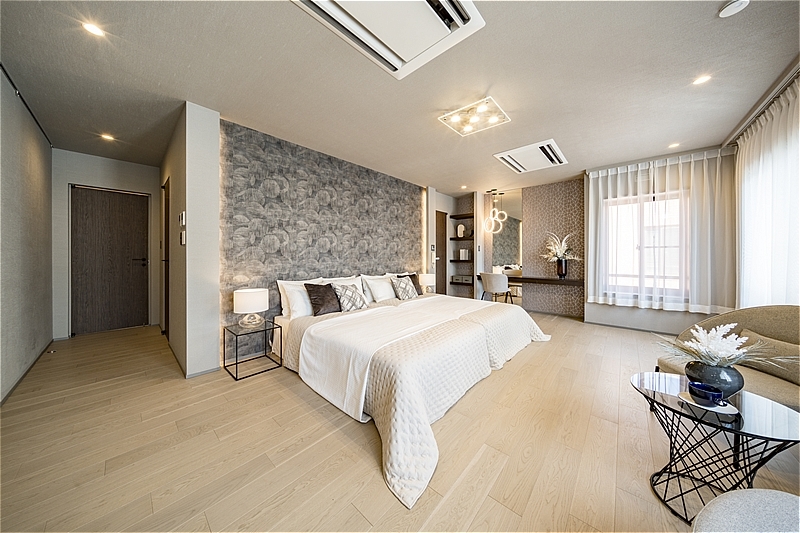 主寝室としての洋室1は、約18.2帖の広さを備えた2面採光の空間です。キングサイズのベッドを配置してもなお十分な余白があり、大型のウォークインクローゼットも完備しています。