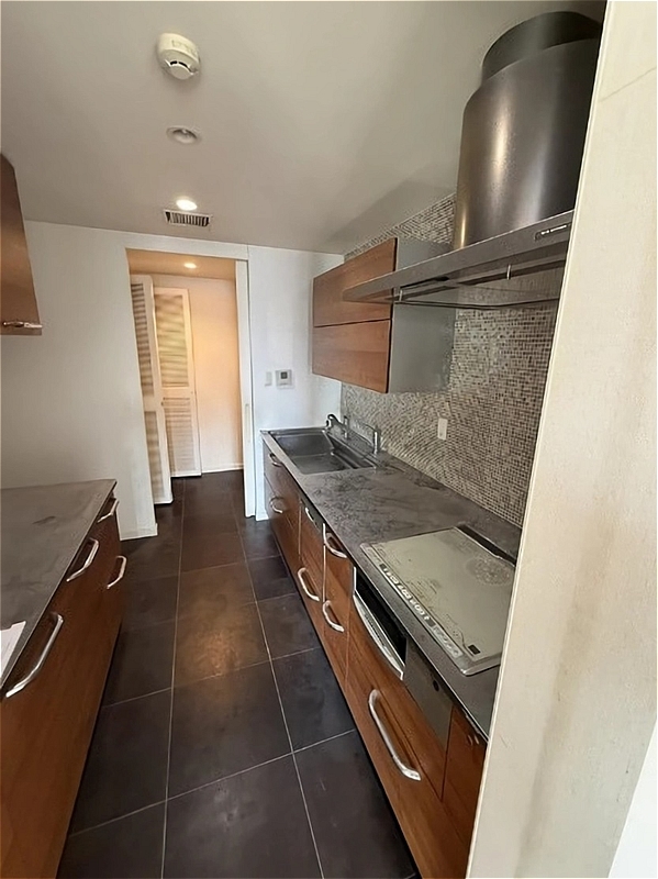 少し奥まったセミクローズドタイプのキッチンと、その奥にランドリーコーナーが続きます。