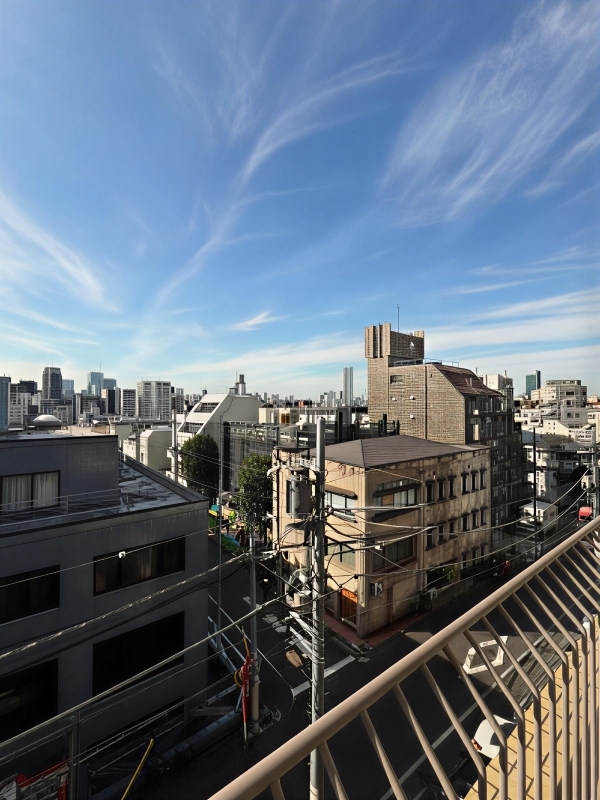 六本木通りに近い立地ですが、周辺は低層の建物が多く、落ち着いた雰囲気。空も仰げて開放感のある眺望です。