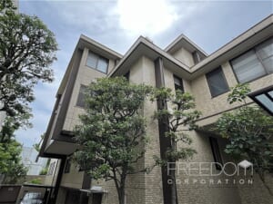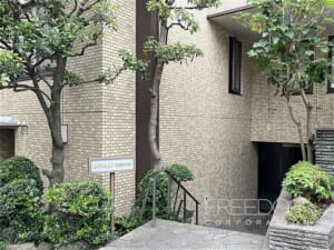 興和不動産旧分譲、施工は大林組による1986年3月築の4階建て、総戸数7戸の格調高い佇まいです。植栽のしとやかな緑と、鉄平石の壁などホーマットらしい和の意匠が調和し、穏やかで静かな時間が流れる住まいです。