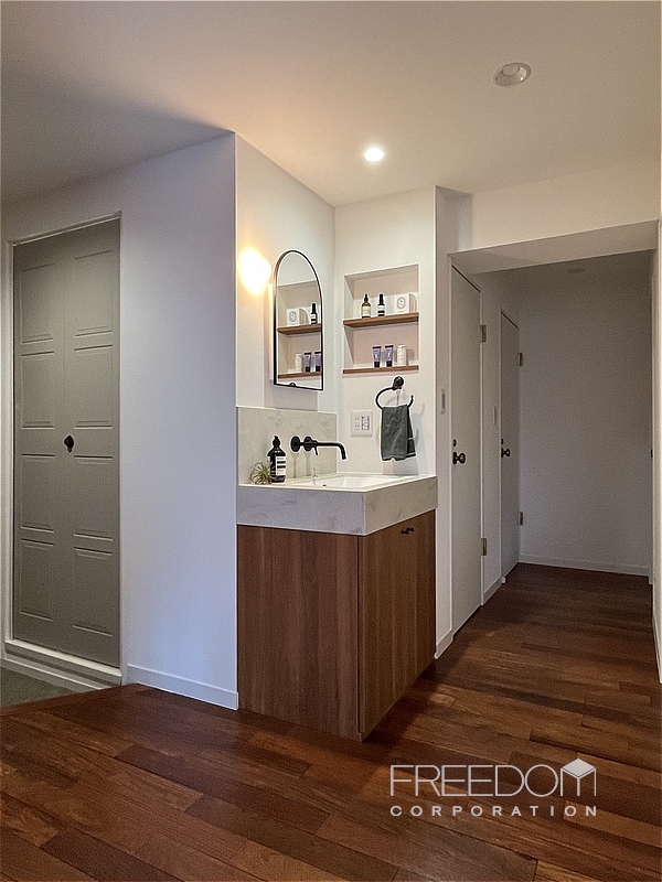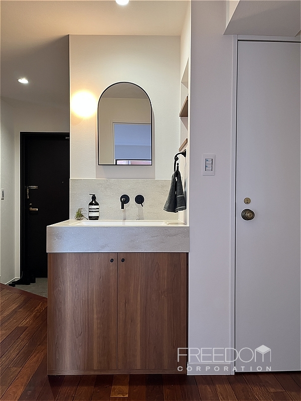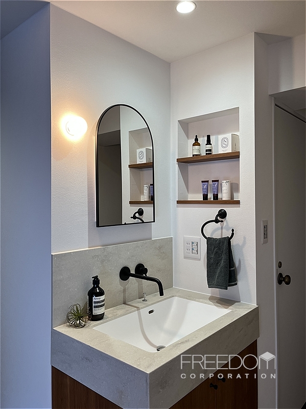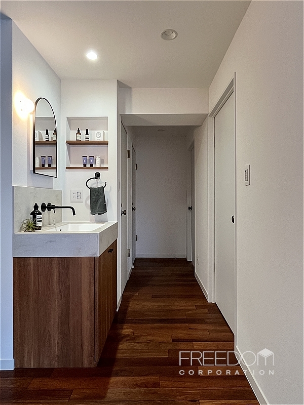 廊下の一角には、独立型の洗面化粧台を配したパウダーコーナーが設けられています。柔らかな曲線を描くミラーと端正なスクエアボウル、マットブラックの水栓金具や、空間に溶け込むニッチ収納など、細部まで丁寧に整えられた上質な仕上がりです。