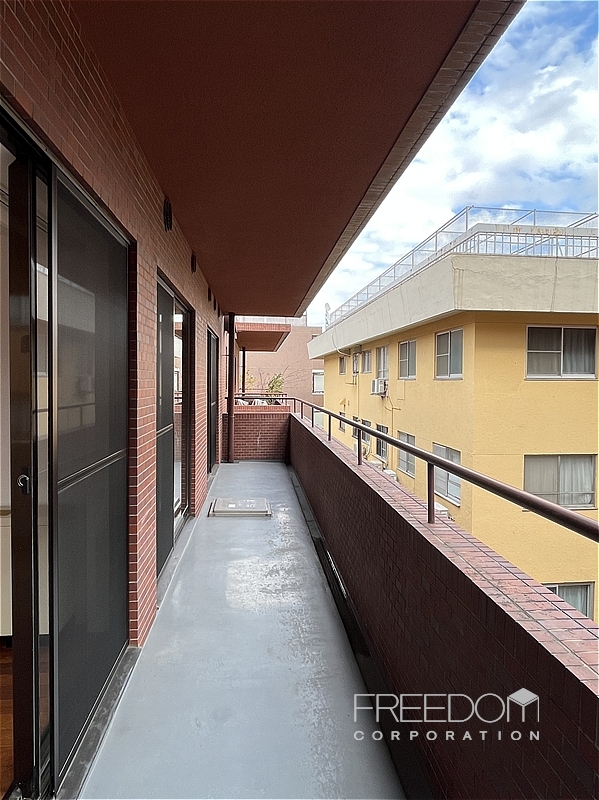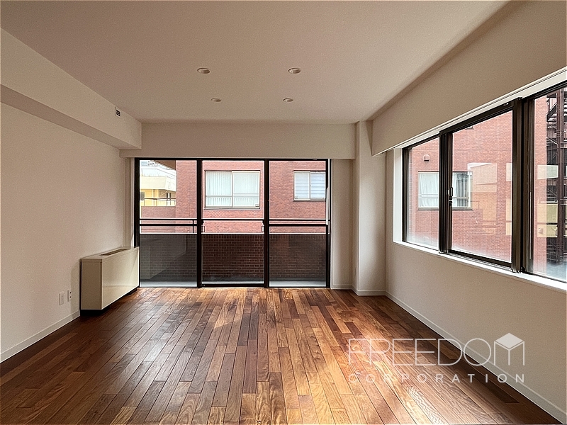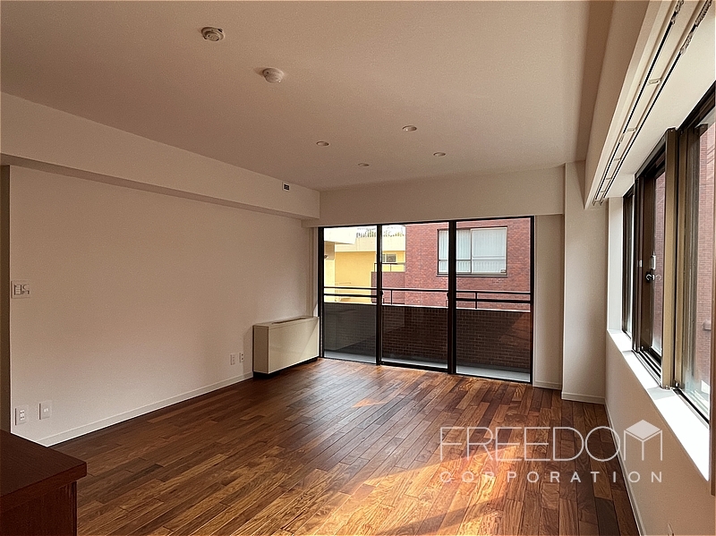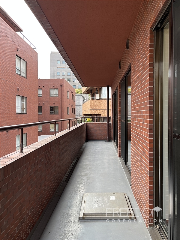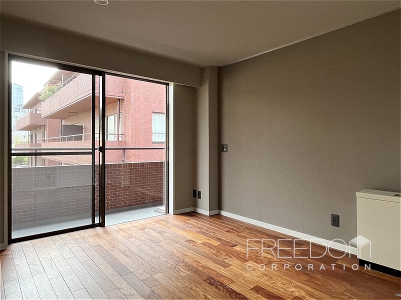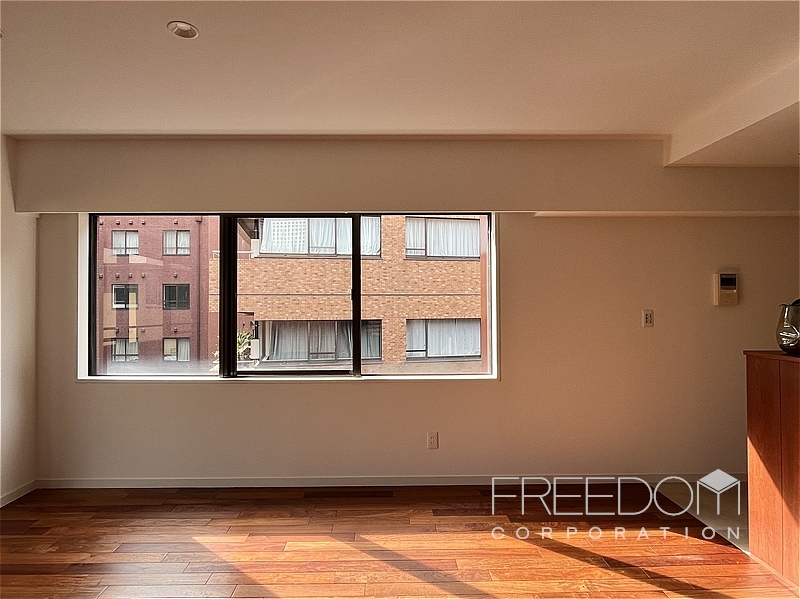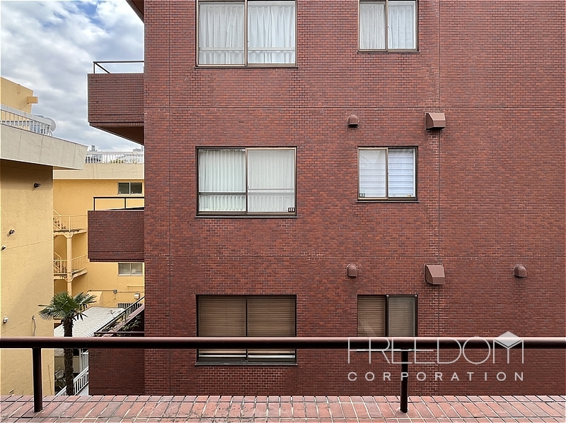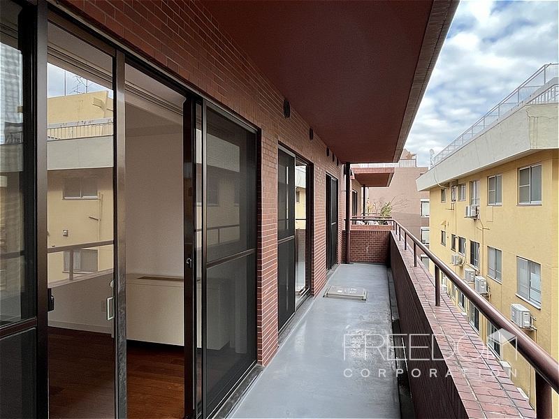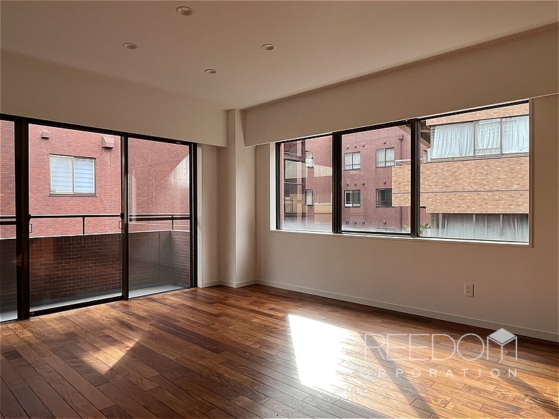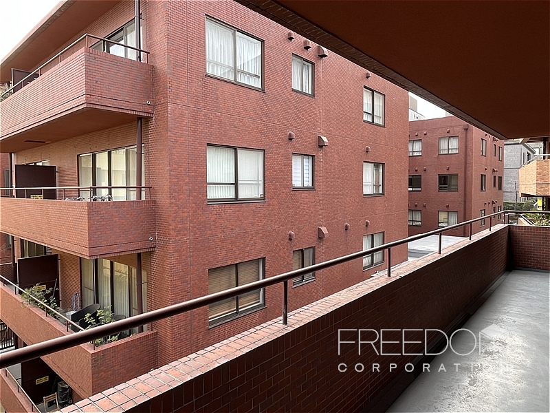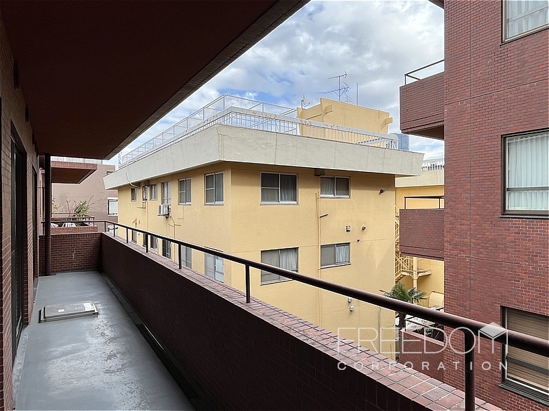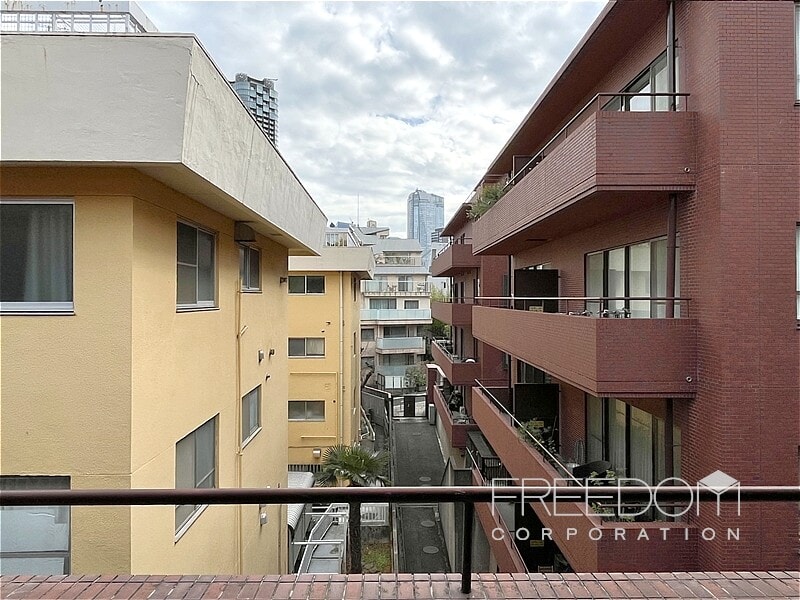 LDから二つの洋室まで連なる全長約10mのワイドスパンバルコニー。別棟と距離が近いため、視線などは少し気になるかもしれませんが、その分、公道からは奥まっていて落ち着いた雰囲気です。日照や通風は確保されており、赤坂の邸宅街らしい静かな眺めが広がります。