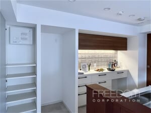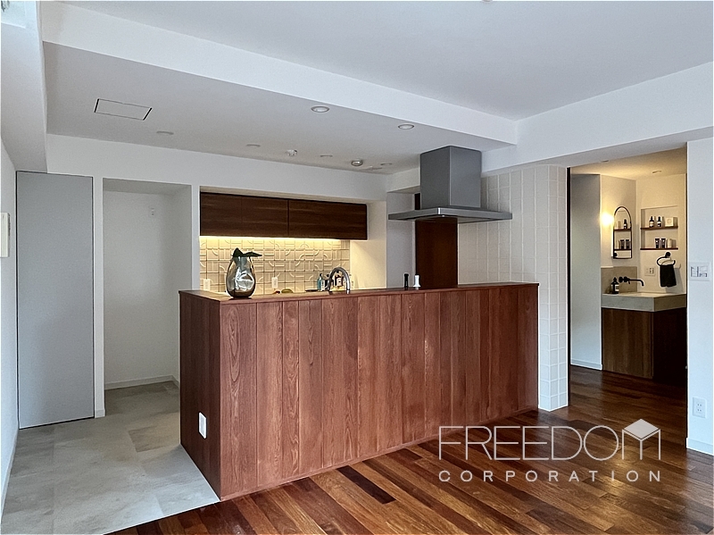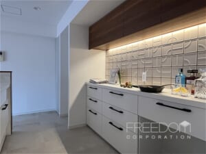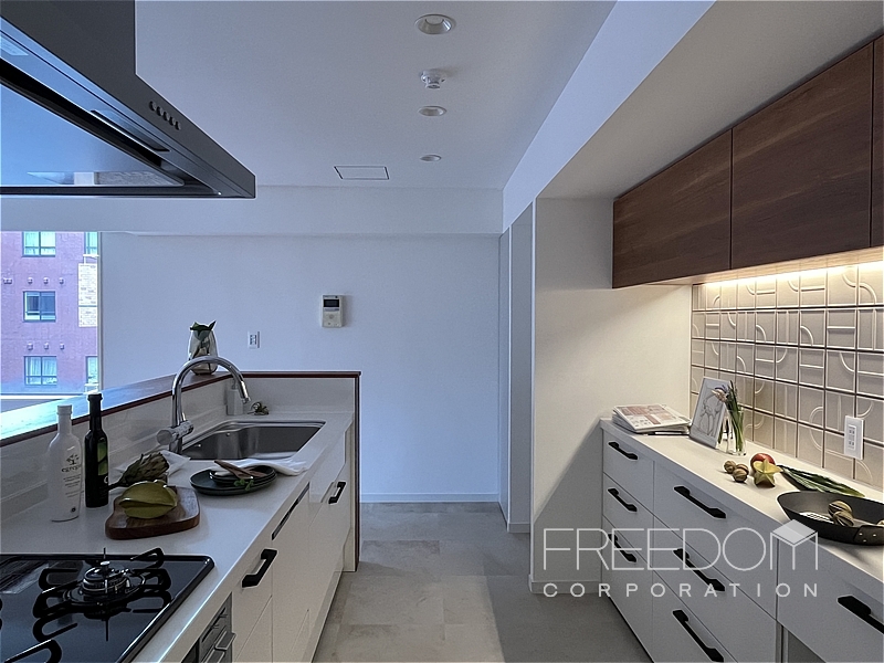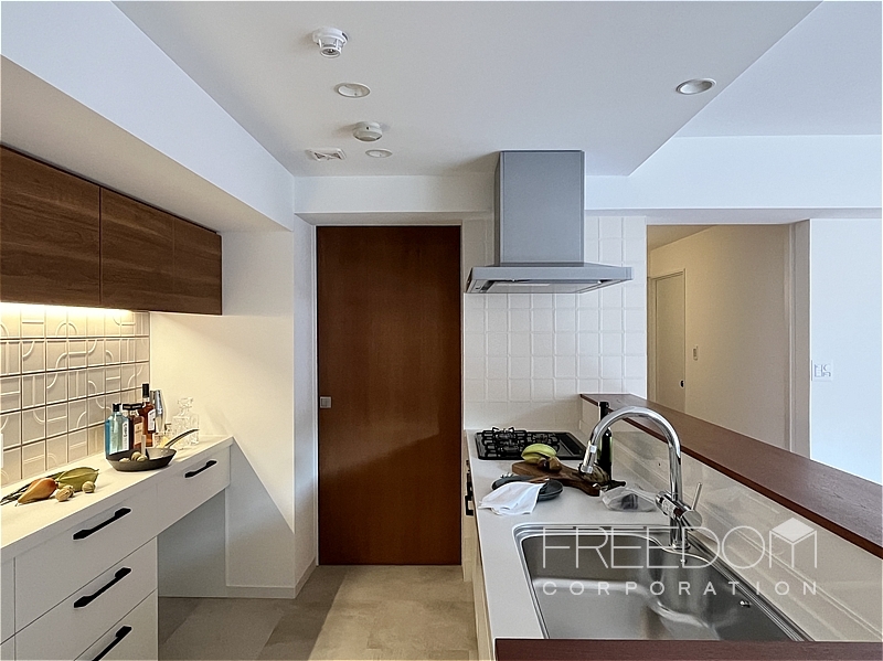 キッチンは、床材と色調を合わせた木目の質感が美しく、家具のような佇まい。手元が隠れるハイカウンターにより、生活感を抑えつつ調理に専念できる造りです。背面には実用的なキッチンカウンターと扉付きの収納棚を備えています。タイルなどの素材使いにもこだわりが感じられ、使うほどに愛着がわきそうなキッチンです。
